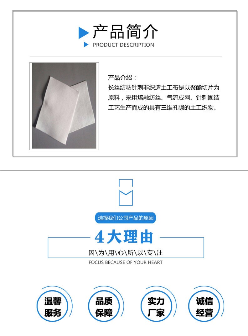 產(chǎn)品介紹: 我們常說(shuō)的土工布即短絲土工布或短纖土工布,它是由合成纖維通過(guò)針刺或編織而成的透水性土工合成材料。成品為布狀。短絲土工布具有良好的力學(xué)功能,透水性好,并能
