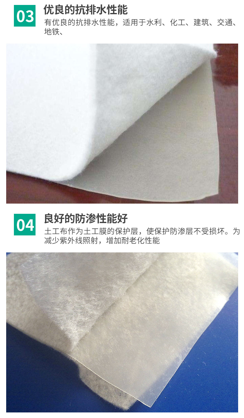 產(chǎn)品介紹: 我們常說的土工布即短絲土工布或短纖土工布,它是由合成纖維通過針刺或編織而成的透水性土工合成材料。成品為布狀。短絲土工布具有良好的力學(xué)功能,透水性好,并能